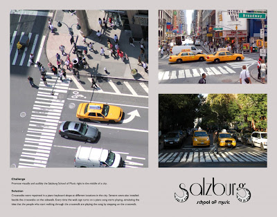 Zebra cross ini juga berlokasi di Swiss sebagai cara promosi sekolah musik Salzburg. Dengan bentuk bilah-bilah piano, zebra cross ini semakin unik karena setiap tanda "boleh menyeberang" menyala akan terdengar alunan piano. Orang yang menyeberang di atasnya bisa berjalan dengan gembira sambil menyanyikan lagu yang terdengar.